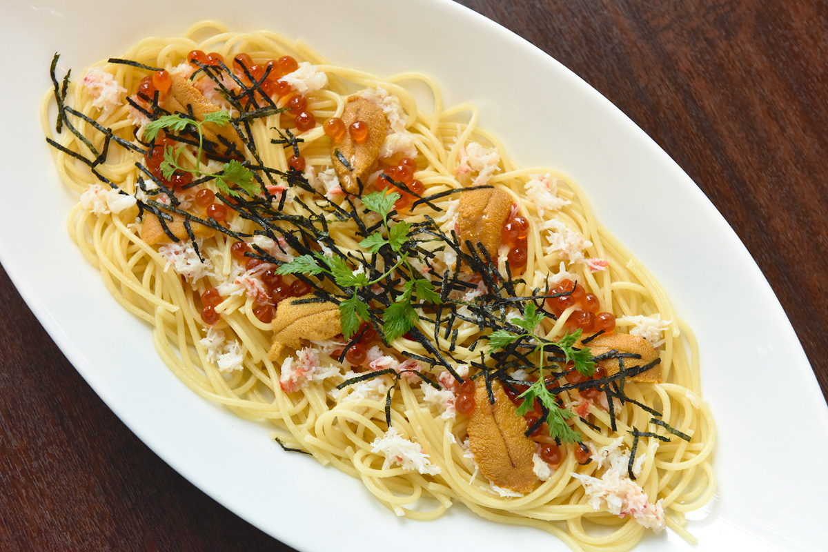 アルデンテに茹で上げたパスタの上に、生ウニ、イクラ、カニをトッピングして、ワサビが利いた特製和風ソースでいただくオリジナルメニューです。ワインやビール、日本酒にも良く合う逸品。
