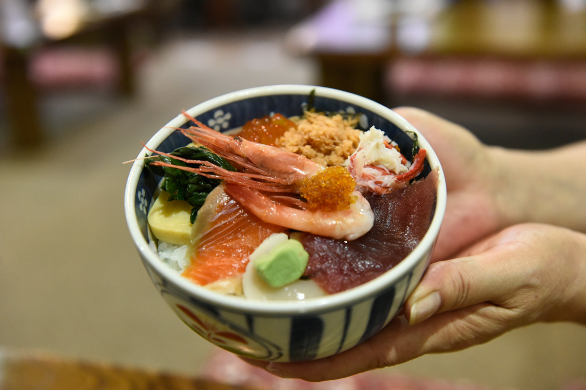 一番人気の五目丼をはじめ、カニ丼、鮭親子丼、ジンギスカン丼、イカ三升漬丼、イカ刺し丼と、地元ならではの味がワンコインでいただけます。1階の市場で購入した食材を持ち込んで調理してもらえるサービスも。