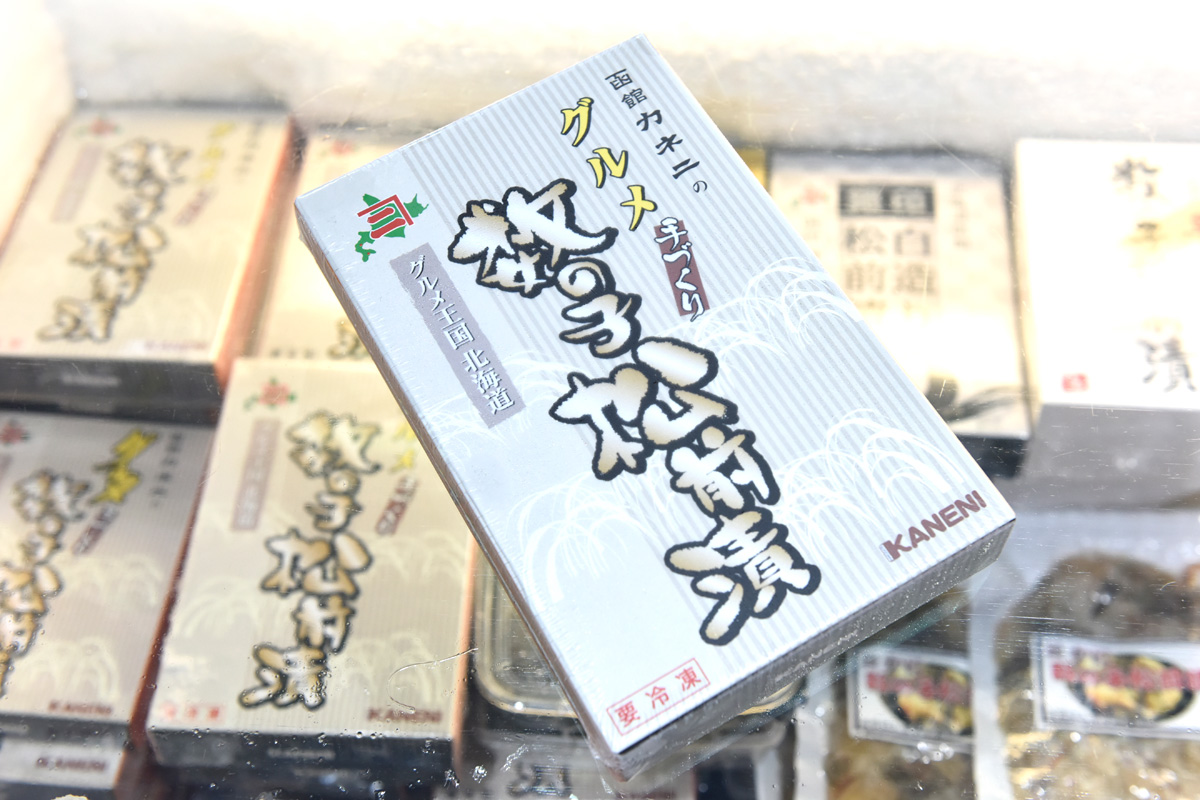 函館カネニ自慢のもう一品は「グルメ数の子松前漬」。松前漬とはスルメイカ、昆布、数の子を醤油などに漬け込んだ道南の松前町発祥の珍味です。