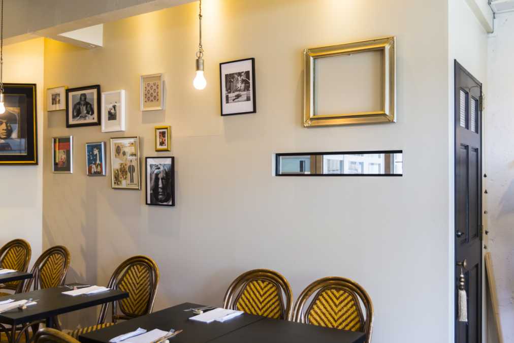 白と黒を基調とし、随所にウッドを取り入れたシンプルな内装は、ヨーロッパの大衆食堂を感じさせる落ち着いた雰囲気。もともとはギャラリーだったというお店は、14席という決して広くはないスペースにもかかわらず、天井が高く開放的です。ご夫婦が好きなものを自由に飾ったという壁のアートにおしゃれ心がくすぐられます。ルイ・アームストロングやウェルドン・アーヴィンの写真は、ジャズ好きのご主人らしいセレクト。