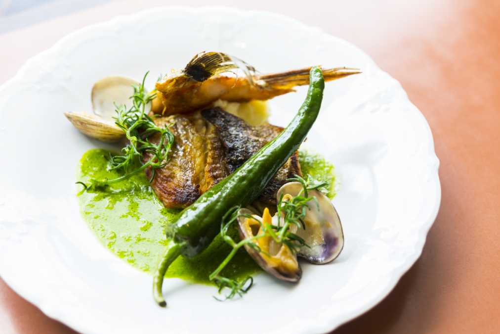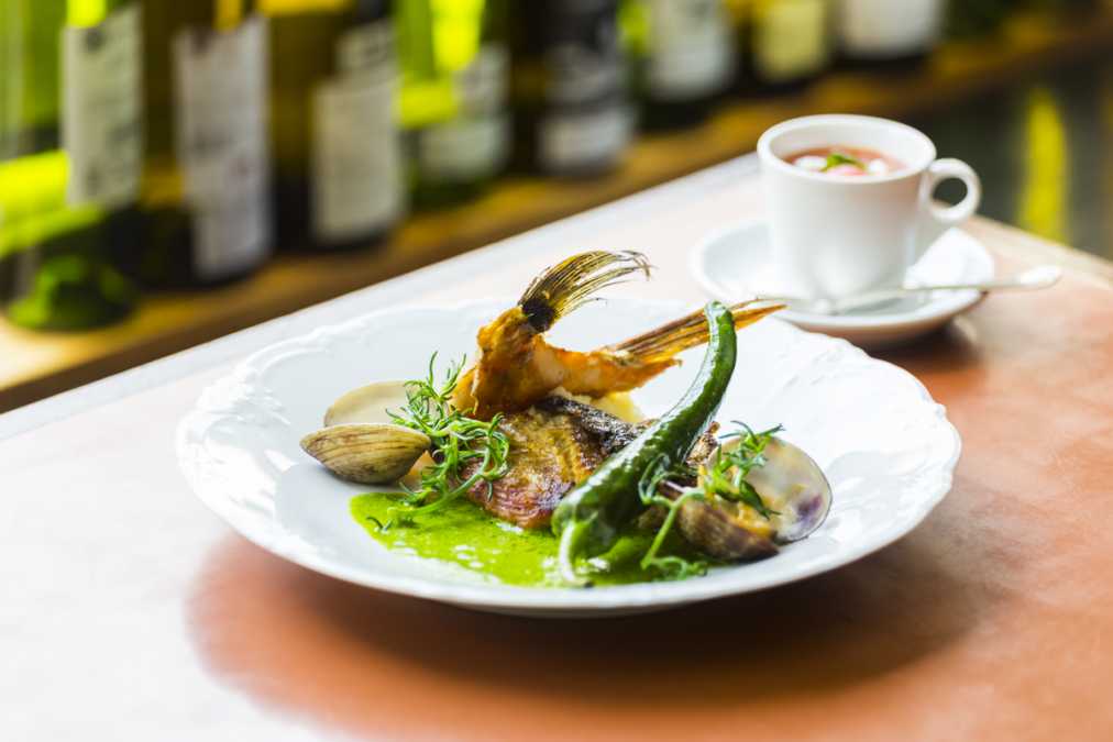 メインにお魚をセレクトしてみました。ルッコラと青唐辛子のソースがかかったスズキのローストは、魚のほどよい塩気と口の中にほんのりピリッと残るソースの相性が抜群。付け合わせのマッシュポテトは、じっくり寝かせることで旨味が増したジャガイモを使用しているそうで、芋本来の甘さが伝わります。ミニスープは「スイカとトマトのガスパッチョ」。ガスパッチョは“飲むサラダ”と呼ばれ、まさに野菜の栄養がぎゅっと詰まった一杯です。