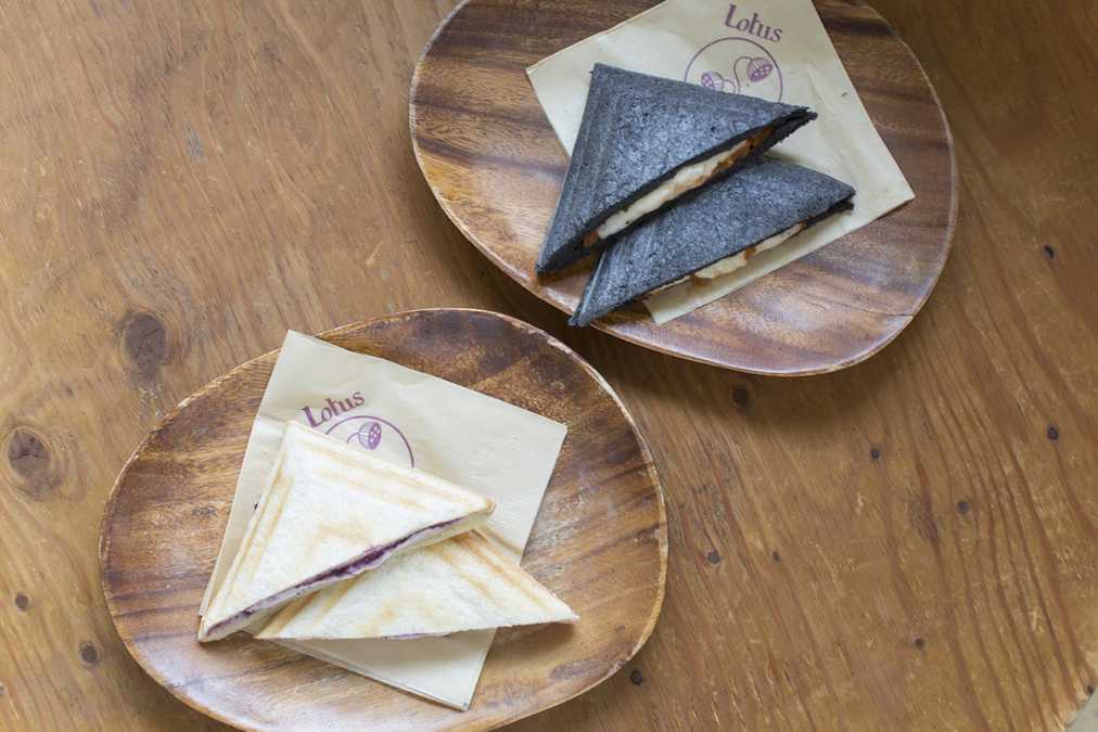人気は横浜限定の「ホットサンド」(400円)。ミネラル豊富な紀州備長炭パウダーを生地に練り込んだ「ヘルシーチャコール」は、驚きの見た目に反してリピーターも多い人気のパンシリーズ。チャコールの食パンに、自家製のトマトソース、モッツァレラチーズ、バジルを入れたホットサンドはマルゲリータのような風味。長野県産の有機ブルーベリーを使用した自家製ジャムとクリームチーズを挟んだホットサンドは、甘い風味がたまらないデザートサンドです。