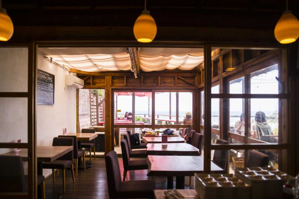 天気のいい日は、座敷スタイルのテラス席でのんびりとお食事を。潮風を感じ、波の音を聴きながら、からだにやさしいヴィーガン料理をいただく時間は至福のひと時です。