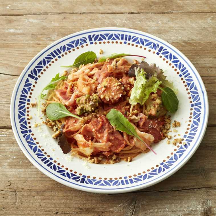 コクのあるオーガニックトマトのクリームソースとクルミで香ばしく仕上げられた「スモークベーコンとごろごろ野菜のトマトクリームソースパスタ」1480円。レンコン、サツマイモなどの秋の味覚に加え、アップルウッドで燻製したベーコンがいいアクセントに。※販売期間:8月30日(木)~9月26日(水)