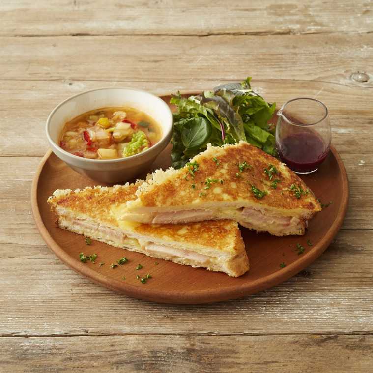 パルメザンチーズをのせて香ばしく焼き上げた「スモークチキンとチーズのフレンチトーストサンド」1450円は、ブルーベリーソースとともに。コクのあるチーズとソースの甘酸っぱさが絶妙!※販売期間:8月30日(木)~ 11月28日(水)
