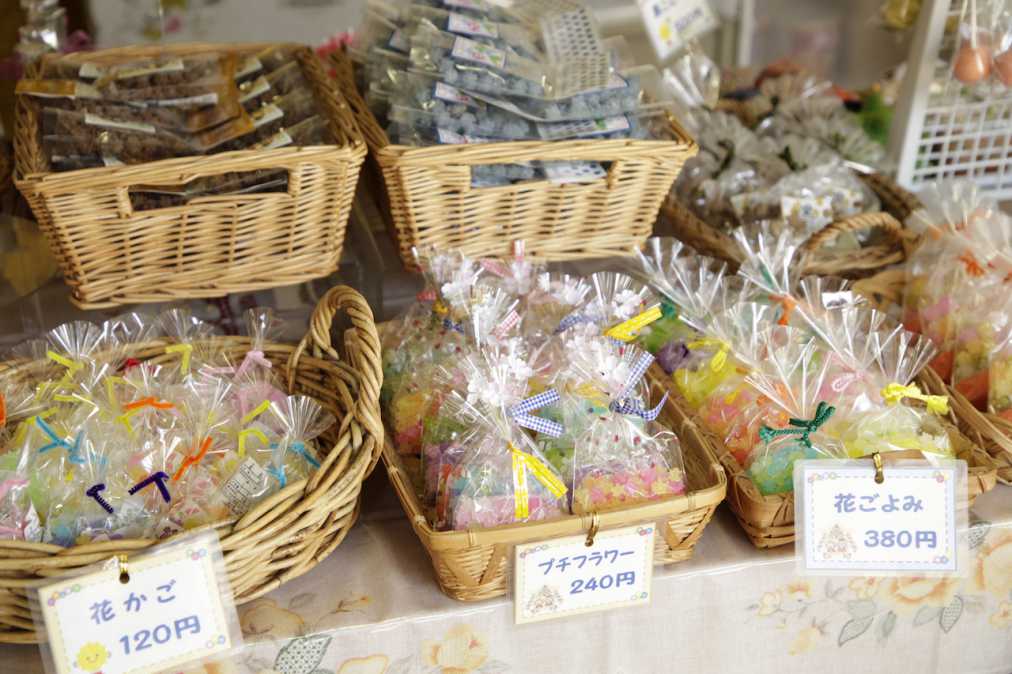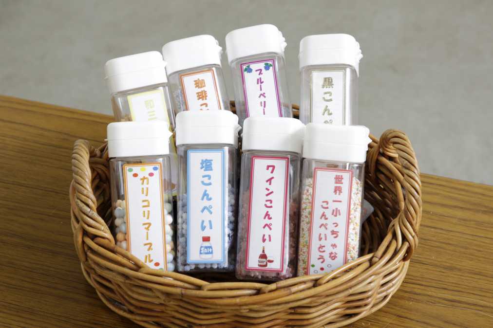入口すぐのショップには、定番はもちろん、サラダやパスタなどの料理に使えるものまで、さまざまなコンペイトウがズラリ。体験で試食した変わり種コンペイトウも販売しているので、お気に入りの味があればぜひ。