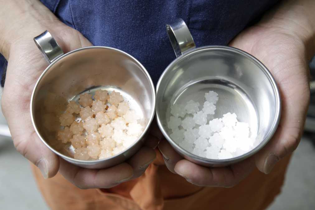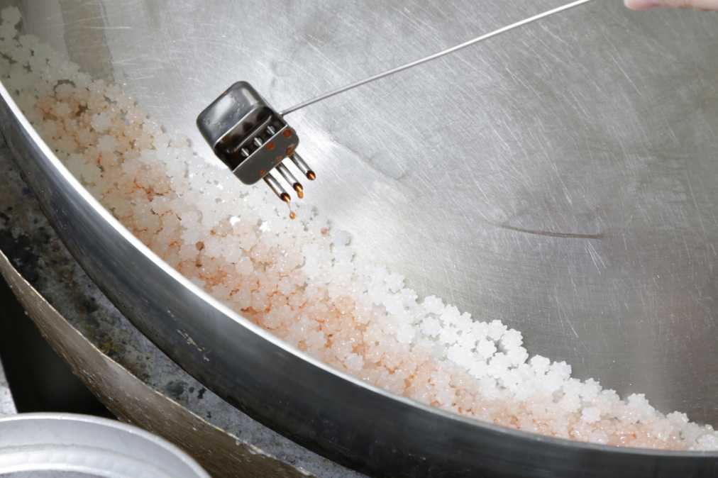 コンペイトウ作りには、ゆっくりと回転する専用の釜を使います。その釜に真っ白のコンペイトウを入れ、天然着色料入りの蜜をかけて混ぜる作業を交代しながら、全体が均等に色付くまで行います。最後に香料を蜜に入れ、色付け作業と同様に蜜をかけていき、味が付けばMyコンペイトウのできあがり!