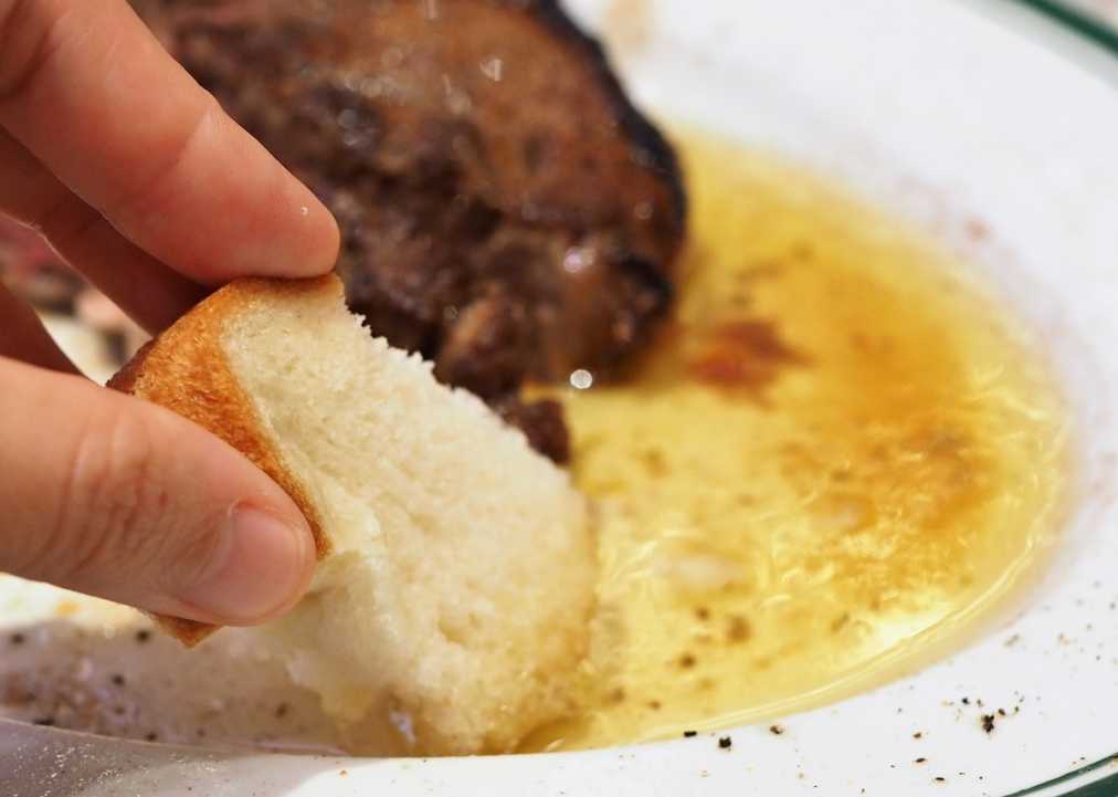 「銀座の食パン~香~」は2カット入りで300円。ふわふわの食パンにお肉の旨みが溶けたバターソースをたっぷりつけて食べれば、美味しくない訳がない。背徳感と幸福感が同時にやってくるこの味、クセになりそうです。実はステーキがのったお皿は斜めになるように置かれるので、ソースが一方にたまってパンにつけやすいのなんの。