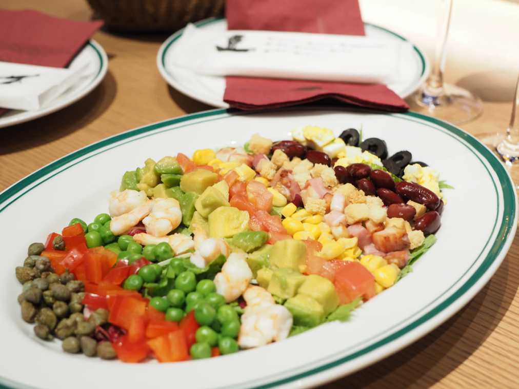 野菜もとらねばということで、コブサラダ~オリジナルサウザンドレッシング~(980円)もいただきます。アボカド、トマト、エビなどいろいろな食感が楽しいサラダ。ドレッシングには山椒が入っていて、ひと味違う旨さです。