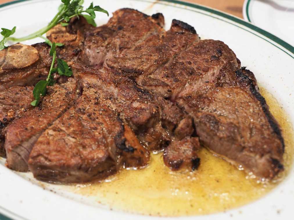 席についたら、早速いただきたいのが「Tボーンステーキ」(900g 3980円)!サーロインとヒレのふたつの部位が楽しめます。900度のオーブンで焼き上げた熱々のステーキは、バターをジュワジュワと泡立たせながら登場。「これ、2人前⁉」と驚きの声をあげてしまう大きさです。ほかのメニューも頼みつつ、3~4人でシェアしてもよさそう。