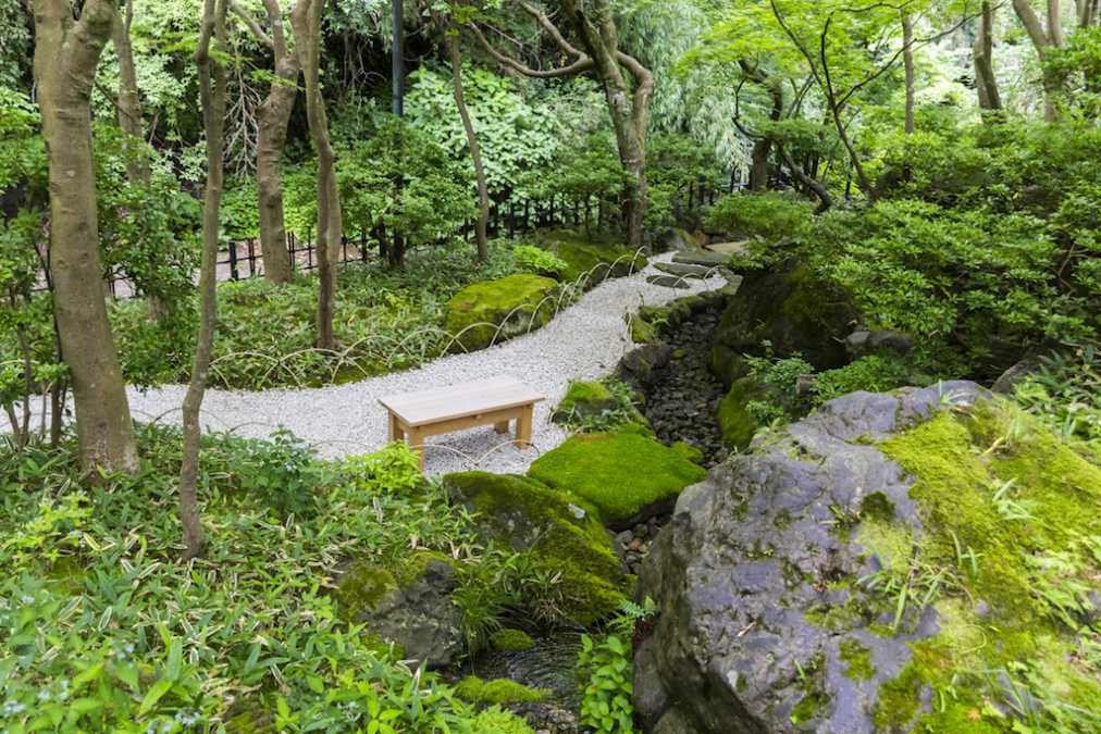 庭園は散策路が整備されているので歩きやすく、広さも約800坪とコンパクト。滑川沿いにはベンチが置いてあり、岩山や川のせせらぎなどをのんびり楽しむことができます。赤松、苔、青もみじなどの緑が美しい庭園には、桔梗、水引などの季節の花も。存在を主張するような派手な花がないところに、わび・さびといった日本らしい美意識を感じます。