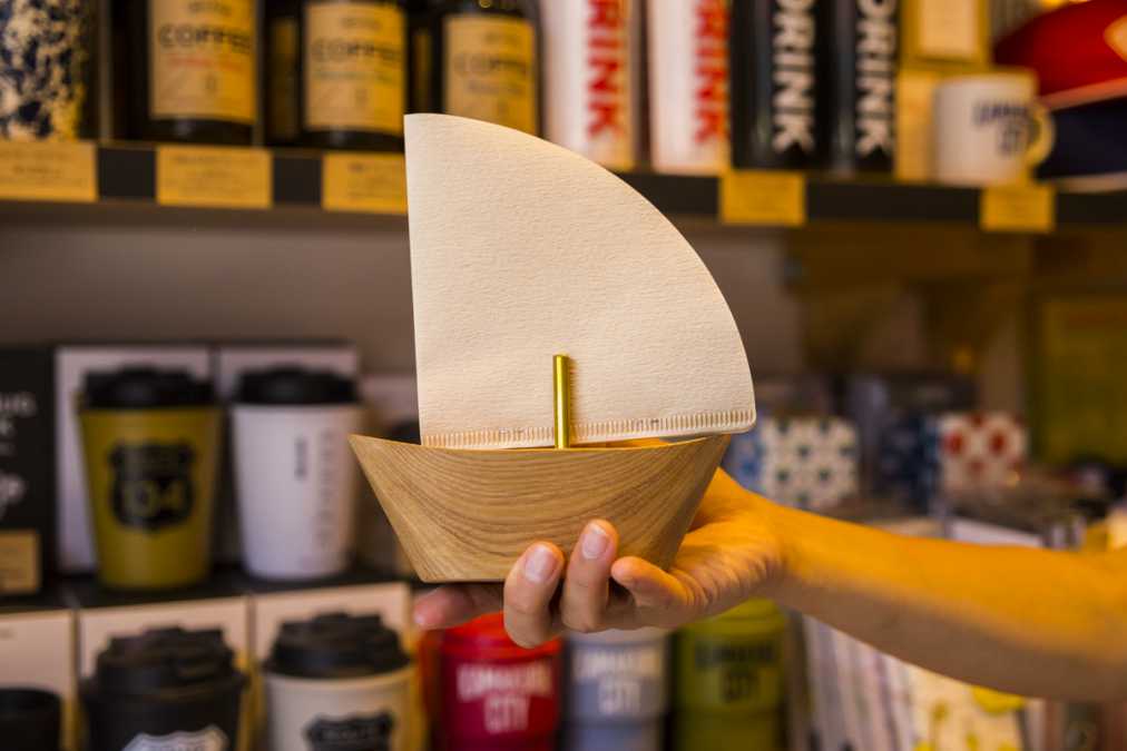 コーヒーのペーパーフィルターがヨットの帆になる「YACHTペーパーフィルターホルダー」(4320円)は、ショップの内装も手がけている「アトリエ ニエフ」によるもの。一生モノになるMADE IN KAMAKURAのまじめなおみやげもあるんです。