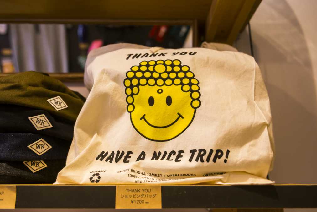 ファッション好きな女子の間では有名なエコバッグ「THANK YOU TOTE」も、WELKAMの手にかかればこのとおり。スマイルマークが大仏になって登場です。「THANK YOU」シリーズはTシャツ(2592円)もあります。キャンバス地の「THANK YOU ショッピングバッグ」は1296円。