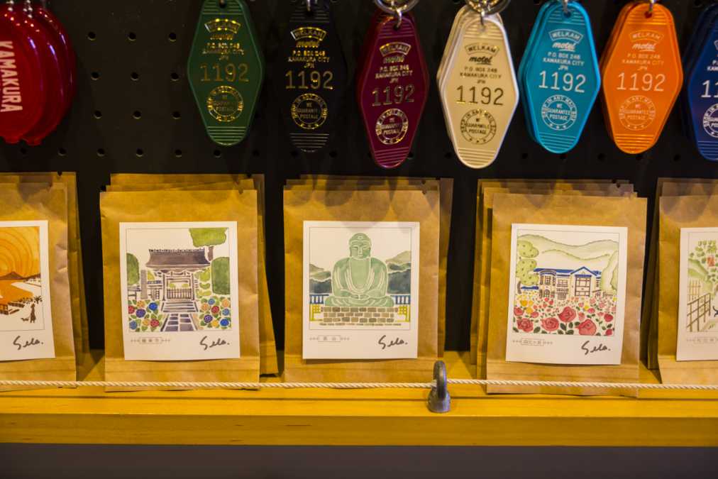 アメリカのモーテルのルームキーをイメージしてデザインされたキーホルダー(648円)は、R134沿いのモーテル「WELKAM MOTEL」の部屋の鍵という架空の設定があります。本場の質感を出すために、アメリカの工場に製造を依頼。カラーは全8色で、グリーンとエンジが人気だそう。鎌倉の観光スポットが描かれているのは「TRIPパックコーヒー」(216円)。中身のコーヒーはWELKAMオリジナルのブレンドで、鎌倉のロースター「イマジネーションコーヒー」によるもの。味わいもグッドです。