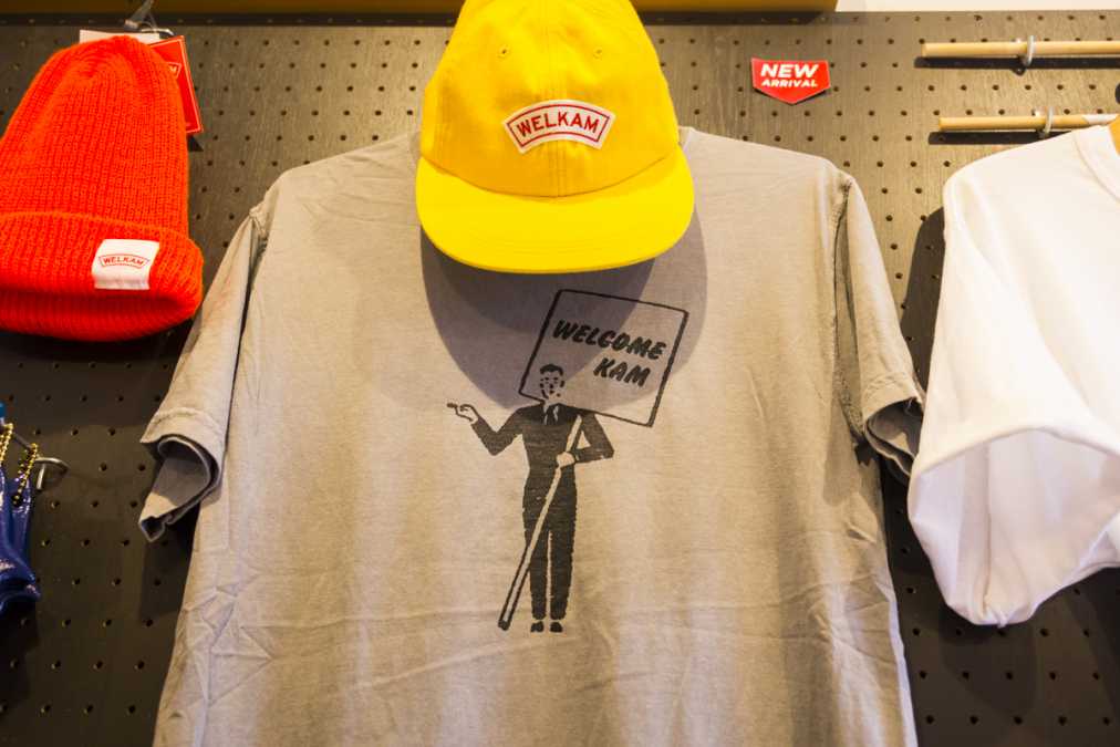 新作のTシャツはシックなデザインとゆるいイラストが魅力。(WEL)COMEに線が引かれて、KAMと訂正されている店名の由来を示したデザインアイデアはショップのエントランスマットにも。新作はシーズンごとにリリースするのではなく、アイデアが浮かんだときに登場するそう。