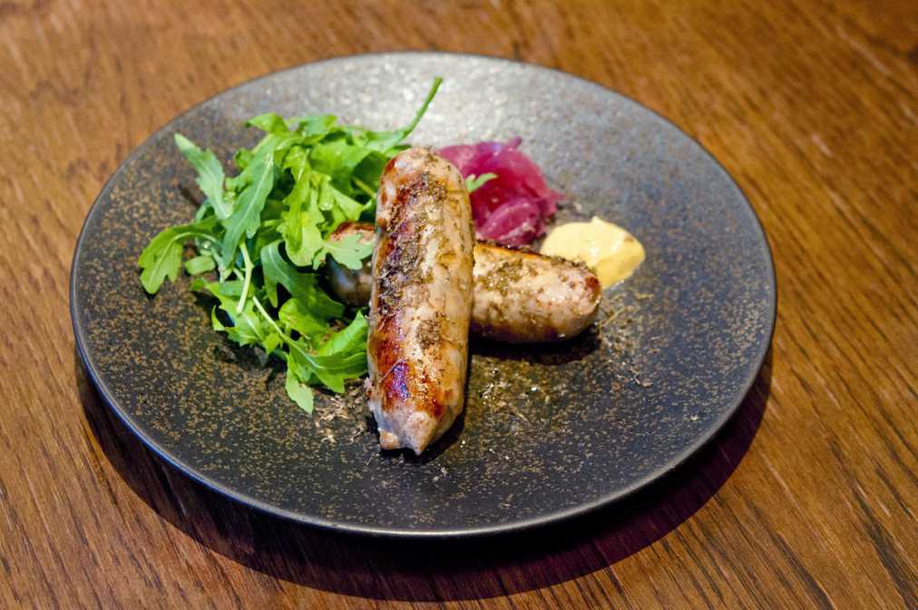 トリュフを混ぜ込んだ、豚もも肉の自家製サルシッチャに、削ったトリュフがトッピングされた「国産豚もも肉のサルシッチャ」1200円(税抜)。