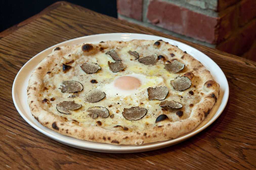 トリュフを加えたソースをベースに、スライスしたトリュフを散りばめた贅沢なピッツァ「ピッツァ タルトゥーフォ ビスマルク(※写真)」2600円(税抜)。半熟の卵とトリュフが絶妙!