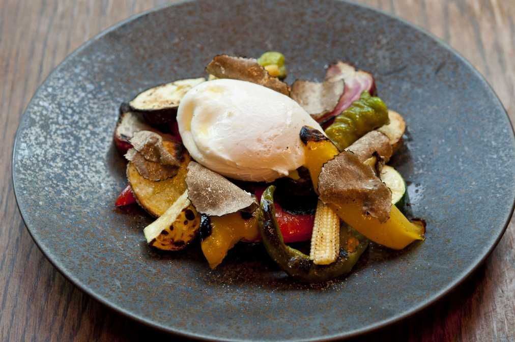 トリュフオイルが香り立つ、新鮮な野菜と卵を使用した「三浦野菜のロースト ポーチドエッグ添え」1000円(税抜)。スライスしたトリュフのトッピングがいいアクセントに。