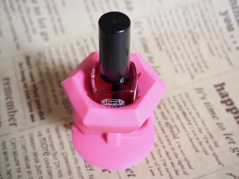 宝石のような可愛い形のネイルスタンドの真ん中にマニキュアボトルを設置して準備完了。底の吸盤を使って、机に固定してスタンドとして使うこともできます。