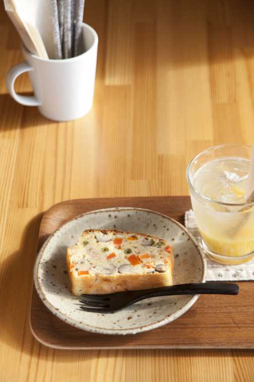ちょっと小腹が空いている時には、ニンジンやインゲンなどの野菜を練り込んで焼き上げたパウンドケーキのケイクサレ400円がおすすめです。具がぎっしりで、見た目よりも満足感があります。さっぱりとしたゆずソーダ400円と一緒にどうぞ。