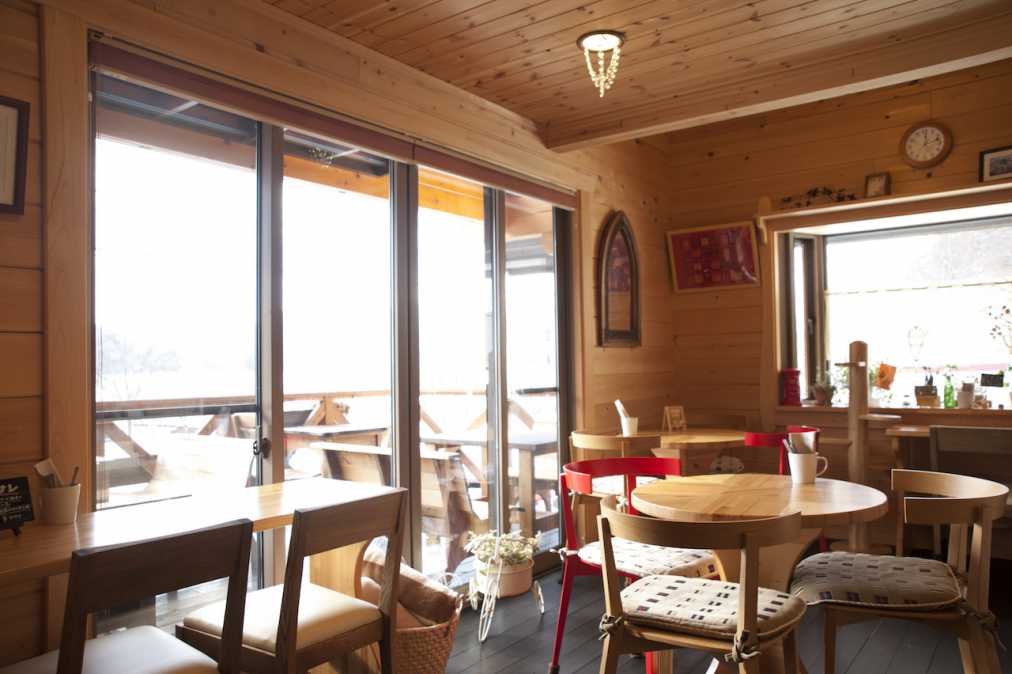 店内からも湖が眺められます。木をふんだんに使った温もりあふれる雰囲気の店内席もおすすめです。