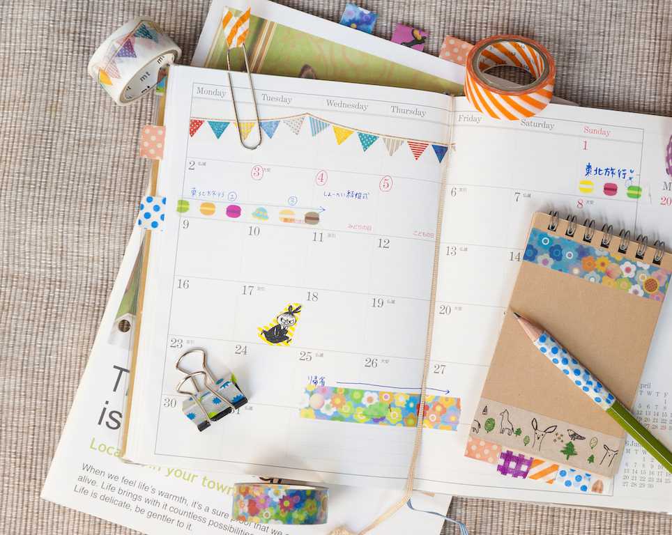購入したテープで、まずは手帳やメモ、文具などをデコレーションしてみて。ペタペタ貼るのはもちろん、付箋がわりに使えたり、クリップなどをかわいくアレンジできたりと、デスク周りが華やかに!