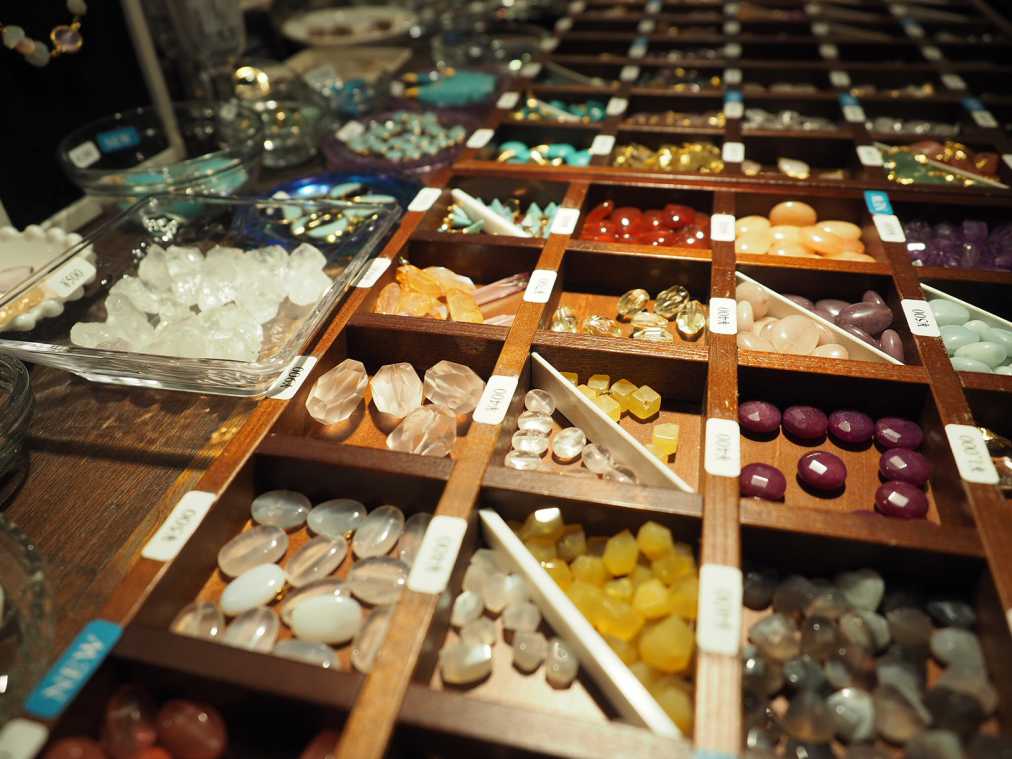 お店中、そこかしこにびっしりと並ぶストーンや金属のパーツは、世界中から集められているもの。入荷するアイテムは常時変わるので、どれも一期一会の出会いです。2度と手に入らない可能性もあるので、ほしいものは見逃さないように!