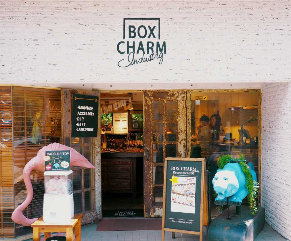 原宿駅から10分ほど歩いた場所に位置する「BOX CHARM Industry」。シンプルな外観に、ポップな動物たちのオーナメントが目印です。