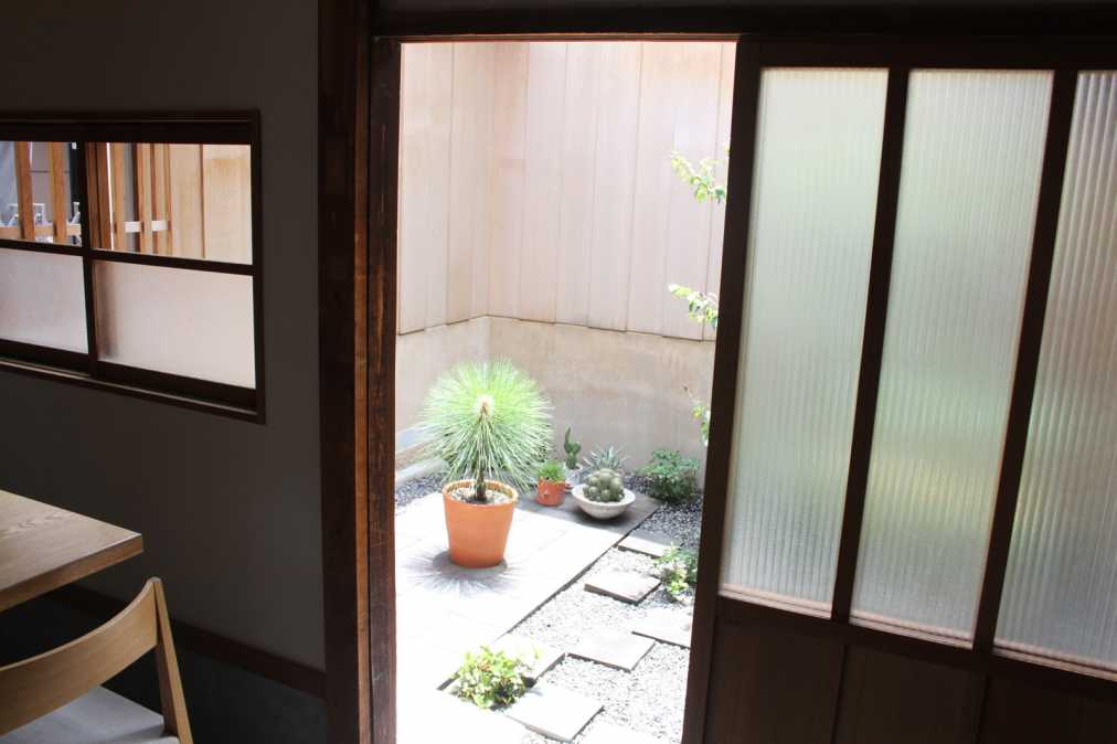 お店は、西陣織の織屋の倉庫として使われていた建物なので、昔ながらの梁や天井の趣を活かしたゆったりとした空間。奥の引き戸の向こうには、お庭もあります。お天気の良い日には眺めを楽しめるかも。