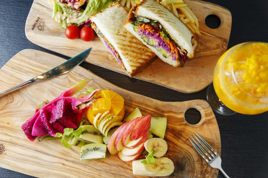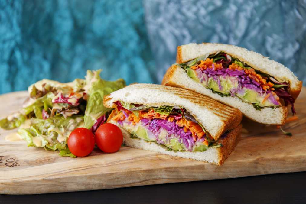 野菜をたっぷり使ったメニューも充実。「彩り野菜のベジタブルサンド」(1000円)は、紫キャベツやアボカド、大豆のフムスなどが入って食べごたえ抜群!ほんのり利かせたカレー風味もアクセントに。