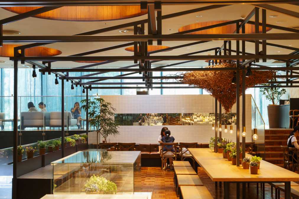 果樹園のハウスをイメージしたという店内は、木の温もりと観葉植物の緑に癒される開放的な空間。窓際にはソファ席もあります。