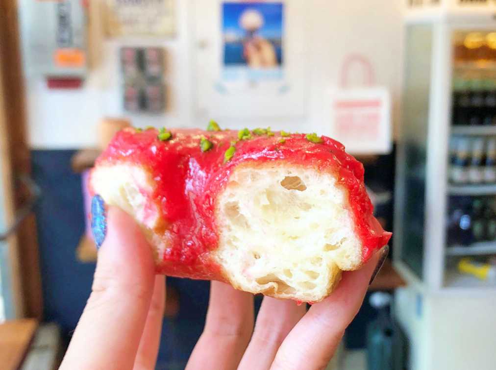 こちらは真っ赤なグレイズドがフォトジェニックな「ラズベリーピスタチオ」(420円)です。生のラズベリーを使ったグレイズドは、フレッシュな甘酸っぱさが楽しめます。上にのったピスタチオのカリッとした食感と風味がアクセントになっています。