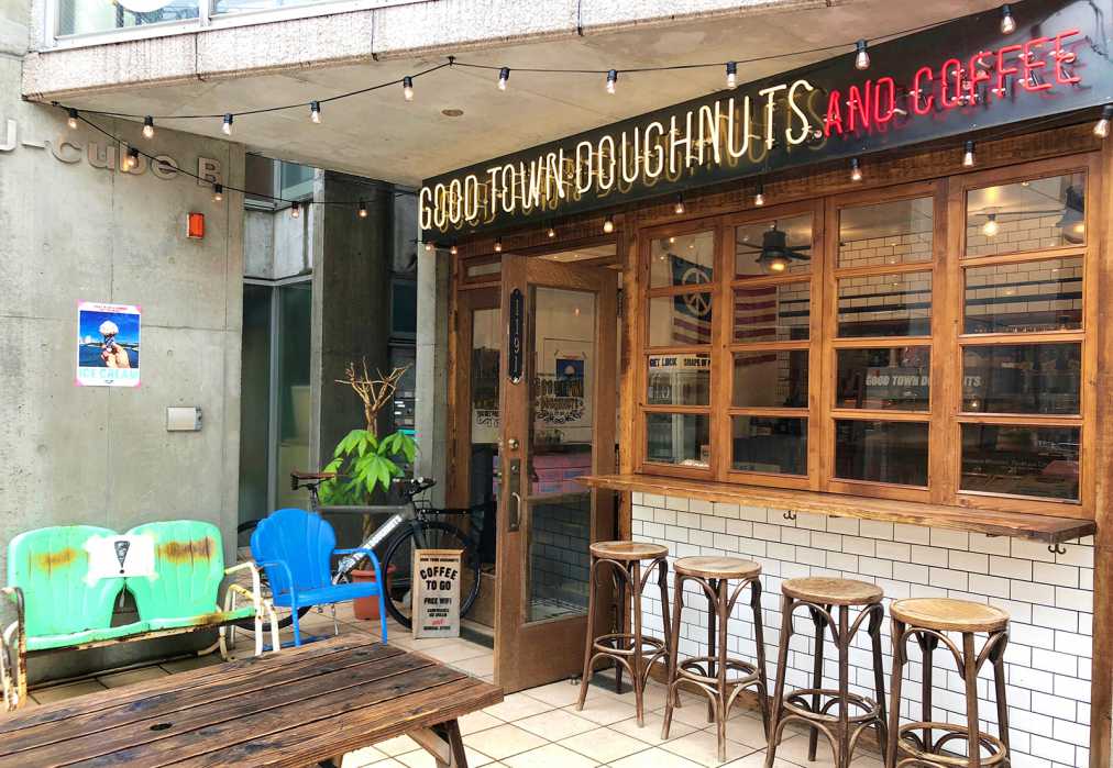 「GOOD TOWN DOUGHNUTS(グッドタウンドーナツ)」は、原宿と渋谷をつなぐおしゃれなお店が集まるキャットストリート沿いにあります。アメリカのカフェを思わせるおしゃれな佇まいが特徴です。