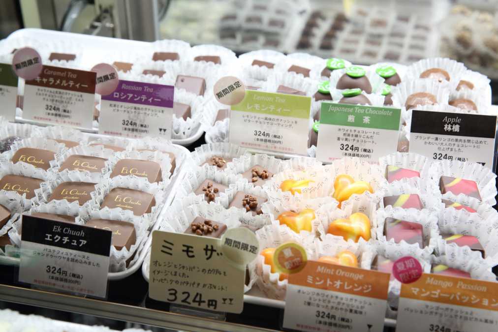おもにベルギーの老舗「カレボー社」のクーベルチュールを使用しているというチョコレート。色とりどりのチョコレートが並ぶショーケースに、ついつい目移りしてしまいます。
