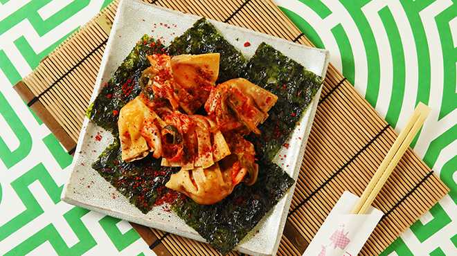 調理法が違うと見た目も味もまったく違う“餃子”に変身!パリっと揚げた「レッツ海苔まき、揚げ餃子」680円(税抜)は、添えられた韓国海苔とキムチがいいアクセントに。