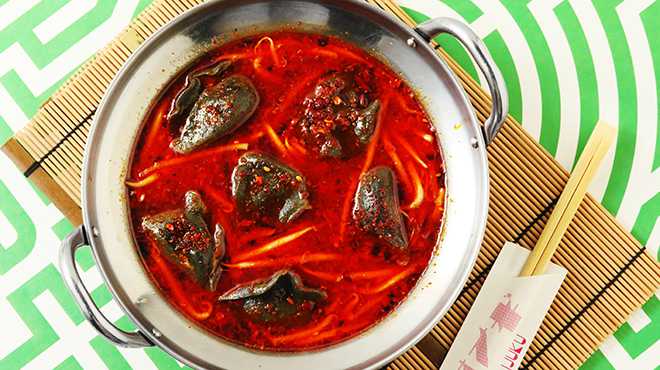 その見た目のインパクトにびっくり!「究極黒餃子の赤辛鍋」880円(税抜)。唐辛子をベースにした赤辛スープは、辛いだけでなく奥深い味わいです。