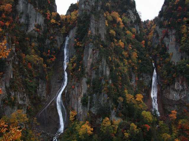 層雲峡の断崖を流れ落ちる、日本の名瀑百選にも選ばれた美しい滝。向かって左、細く優美な線を描く白糸のような滝が「銀河の滝」、太く勢いよく強く流れ落ちる滝が「流星の滝」です。駐車場に車を停め、滝を背にして20分ほど斜面を上がった「双瀑台」からは、2つの滝を同時に見ることができます。
