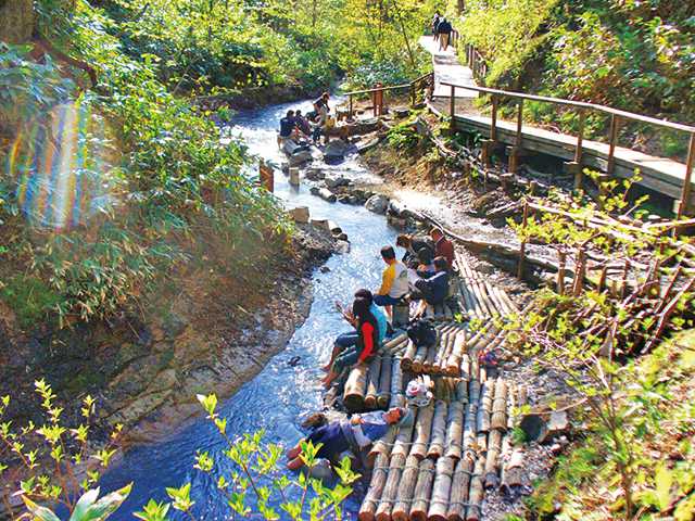 大湯沼から流れ出す温泉の川岸に、木のベンチが設置された天然の足湯スポット。上流ほど湯の温度が高く、下流に流れるほどに適温になっていきます。緑に囲まれて森林浴をしながらの足湯は、じんわりぽかぽか、至極のリラックス・ヒーリングが楽しめます。
