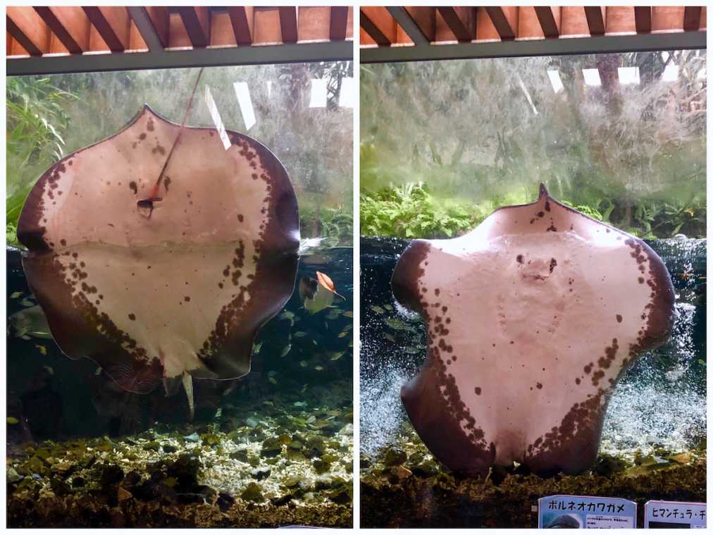 まったりとお魚を眺めていると、巨大なエイのご飯タイムイベントが始まると館内放送が。飼育員さんが餌を上から差し出すと「待ってました!」と言わんばかりの、大ジャンプ!さっきまで水槽を優雅に泳いでいたので、その豹変ぶりに思わずびっくり!大人でもはしゃいでしまうほどの大迫力です。