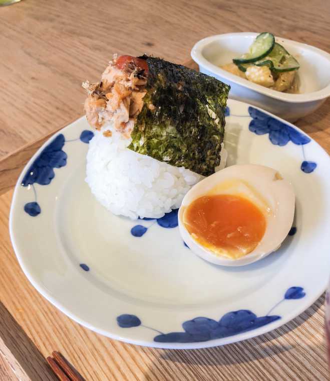 味噌汁とおにぎりのほかに、煮卵、小鉢2種類、お新香がついていて小鉢とお新香は野菜等の入荷状況によって内容が変わります。この日は、ナスときゅうりの酢のもの、塩麹のつけもの、冷や奴というラインナップ。いずれも素材そのものの味を引き出す味付けで、とてもおいしい!