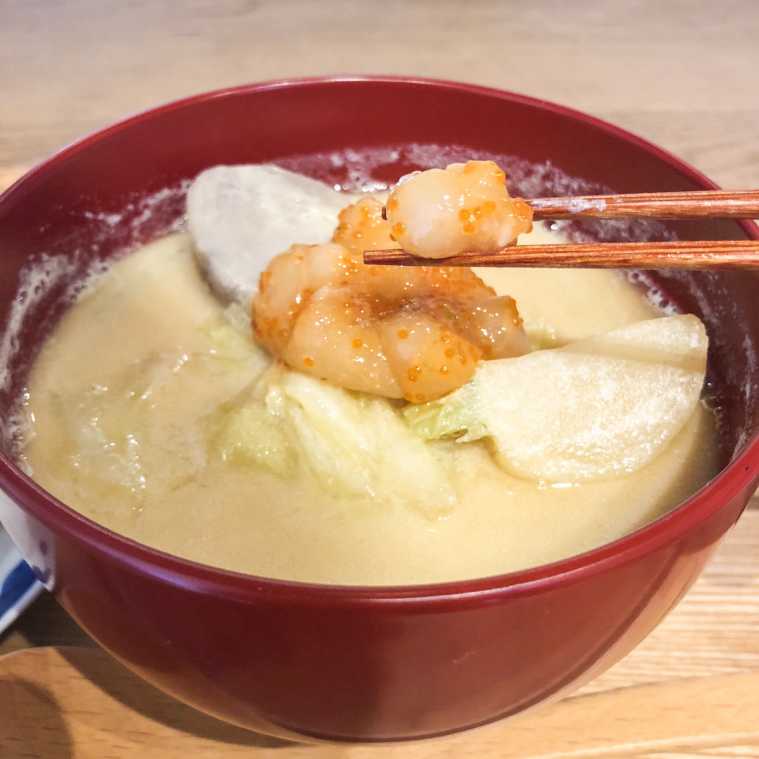 上に乗っているのはホタテととびっこを酢味噌と柚子味噌で味付けたもので、これがまた絶品!そのまま食べてもいいですし、少し溶いてマリアージュを楽しむのもおすすめです。