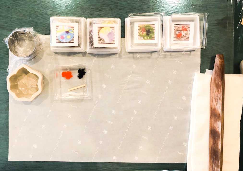 受付を済ませると、すでにそれぞれの席には使用する道具と、和菓子の材料が入ったケースが並んでいます。完成イメージを見て、この和菓子はどう作るのかな?道具はどうやって使うんだろう…と想像を膨らませながらスタートを待ちましょう。