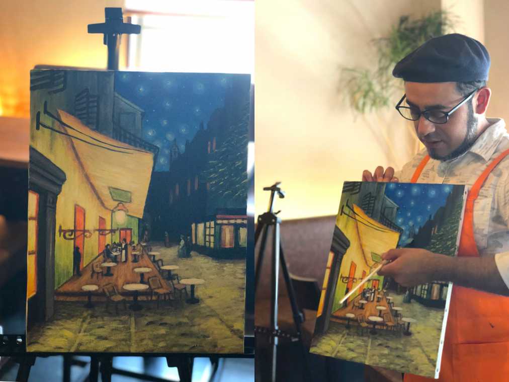 今回描く絵は、ゴッホの「夜のカフェテラス」。初心者でもこんな素敵な絵が描ける秘訣は、アーティストの先生がしっかりレクチャーしてくれるから。この会の講師は、壁画・アクリル画家で、小学校の美術講師も務めるメキシコ人のロチャ先生。現役アーティストから教えてもらえるのはうれしいですね!