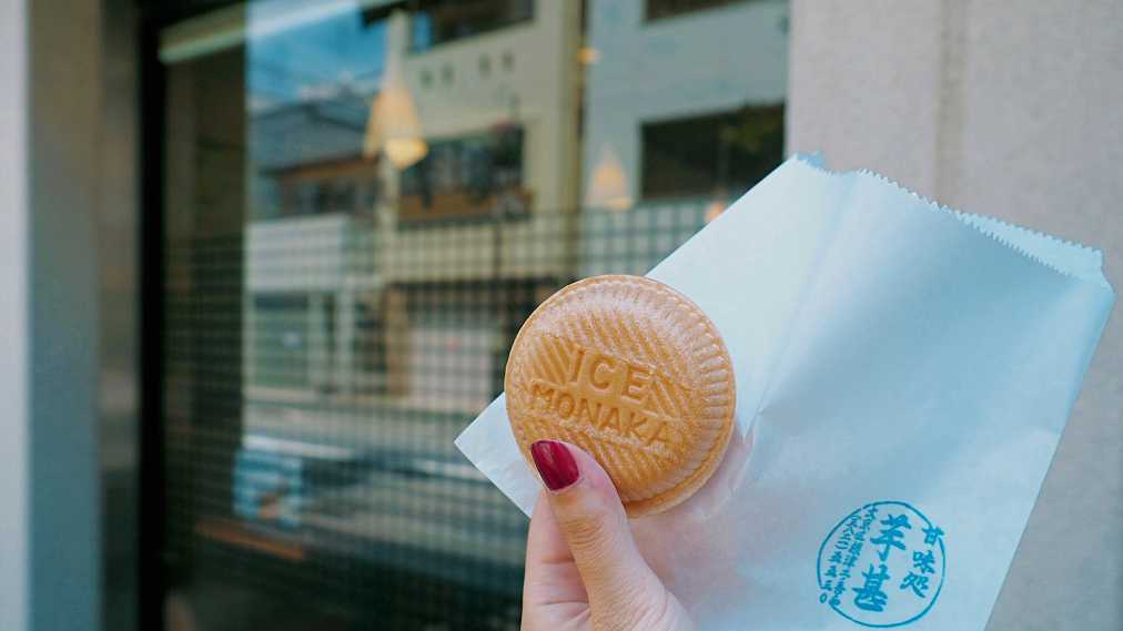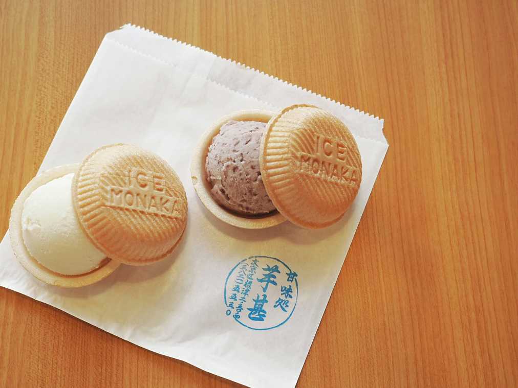 彼やお友達と来たなら、2つのアイスがセットになった「アベックアイス」(店内280円、テイクアウトは1個120円)もオススメ!店内でいただく場合は銀の皿にアイスを盛っていただけますし、テイクアウトの場合はこのように小さなモナカに詰めてもらえます。手の平サイズなので、街歩きをしながらいただくのにもぴったり!