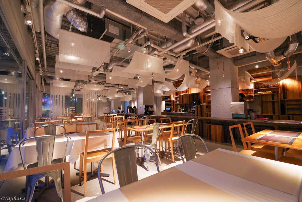あえてむき出しにされたダクトとコンクリートの壁。天井からは白い布が垂れ下がり、全体的に低めのテーブルやソファで揃えられているため開放感があります。