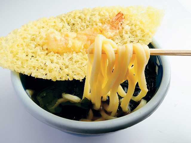 お客さんの多くが注文するという天ぷらうどんは、器からはみ出す特大サイズ。木の葉型のエビ天は、つい写真を撮りたくなるインパクト!まずはひと口、サクサクの食感を楽しんだあとは、ダシにつけて違った歯ごたえを。創業当初からロングセラーのメニューは、見た目だけでなく味も確か。太めでコシのある麺は喉越しも最高です。
