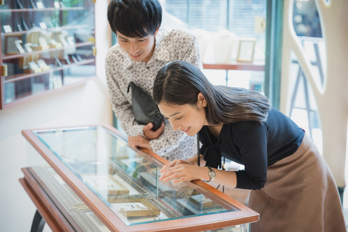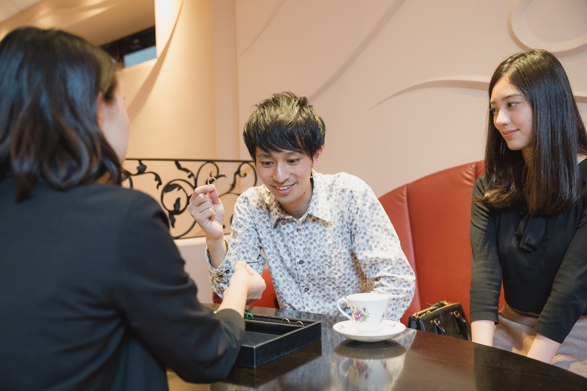 ジュエリーショップは入りづらくて苦手、なんて男性も多いはず。実は、このプランの嬉しいポイントのひとつが、彼のジュエリーショップへの抵抗感が払拭できること。時間をかけて、親身になって相談に乗ってもらっているうちに、そんな印象はふっとんじゃいます。