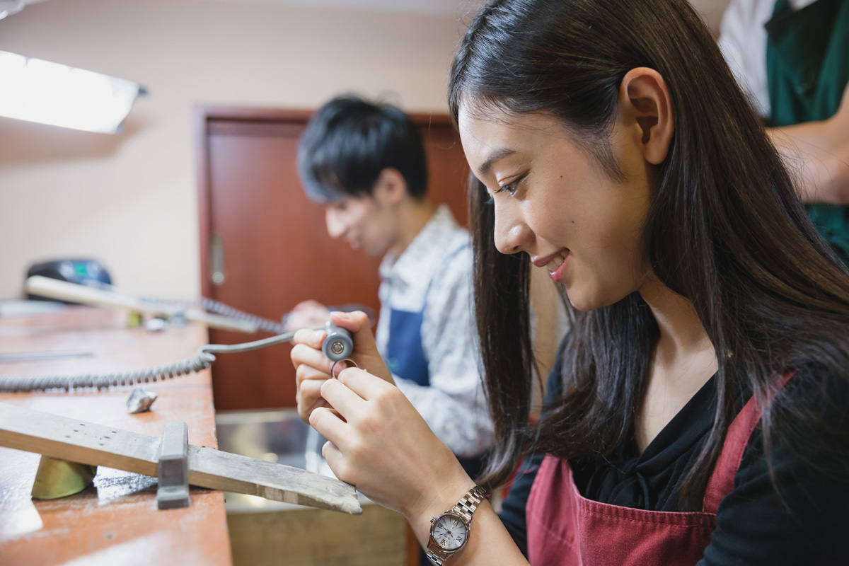 つなぎ目をくっつけたら、サイズを合わせて形を整え、専用の道具で指輪を磨いていきます。みるみるうちにピカピカになるので、ついつい没頭してしまいます。キレイになったら、職人さんが最後の仕上げを施してくれるので、出来上がりを楽しみに待ちましょう。