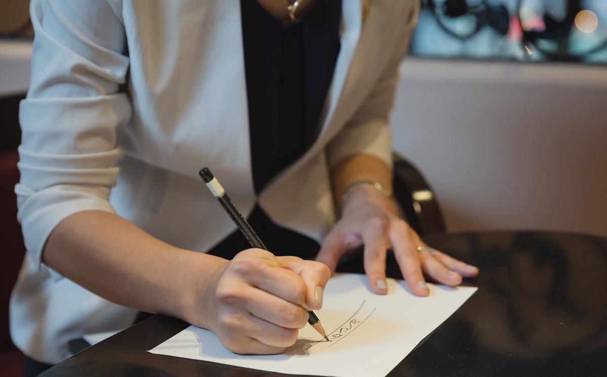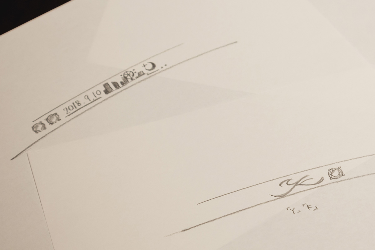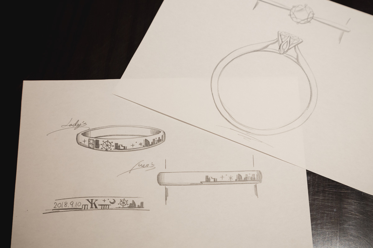 今回のDIYプランでは、指輪自体は作りやすいシンプルな形ですが、オプションでリングの裏に好きな模様や宝石を入れることができます。2人のイニシャルをデザインしたり、横浜らしいモチーフや、記念日の日付を入れたり、できることは無限大です。デザイナーさんが好みや要望を元に、デザインをその場でスラスラ描いて提案。こんな素敵なデザインができるなんて!とワクワクが止まりません。