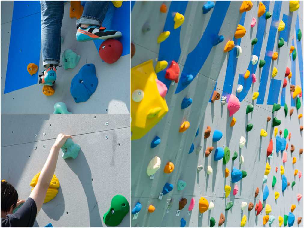次にチャレンジしたのはボルダリング(平日1000円 平日17時〜、土・日曜、祝日は1800円/1人1時間あたり)。興味はありつつ、ボルダリング専用スタジオに行くのはなかなかハードルが高いと感じている方もここなら気軽に挑戦することができそう。シューズの貸し出しも料金に含まれているので、手ぶらでもOKです!